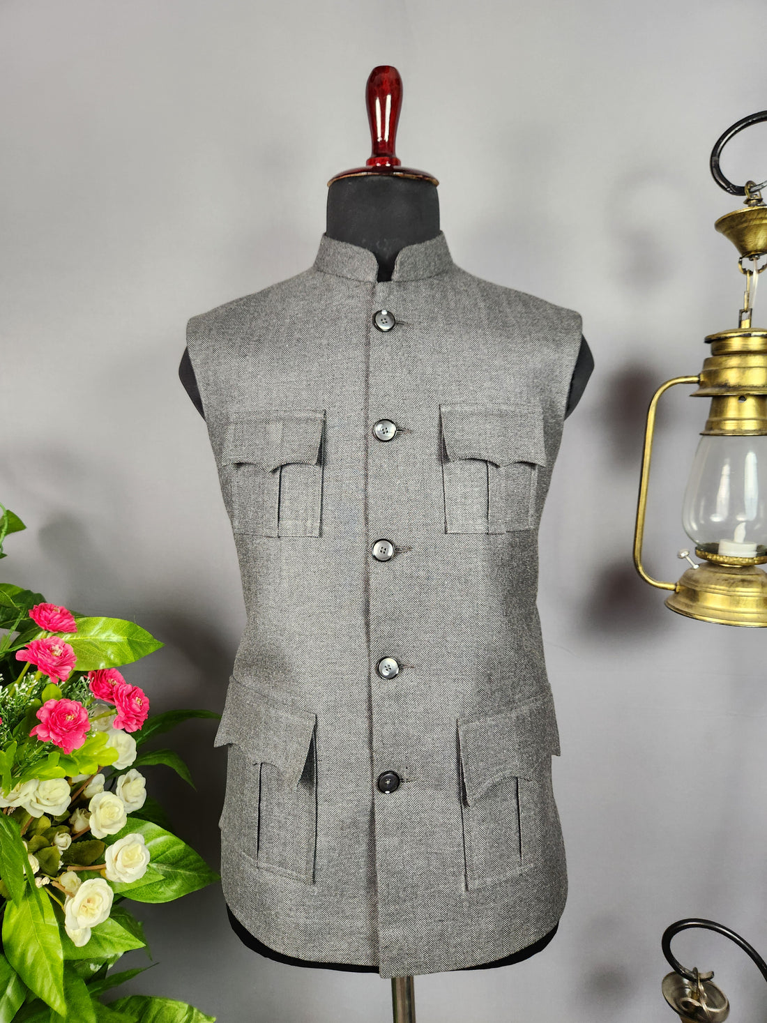 Gray Tweed Nehru Jacket for Men | Indian Ethnic Waistcoat for Weddings & Celebrations