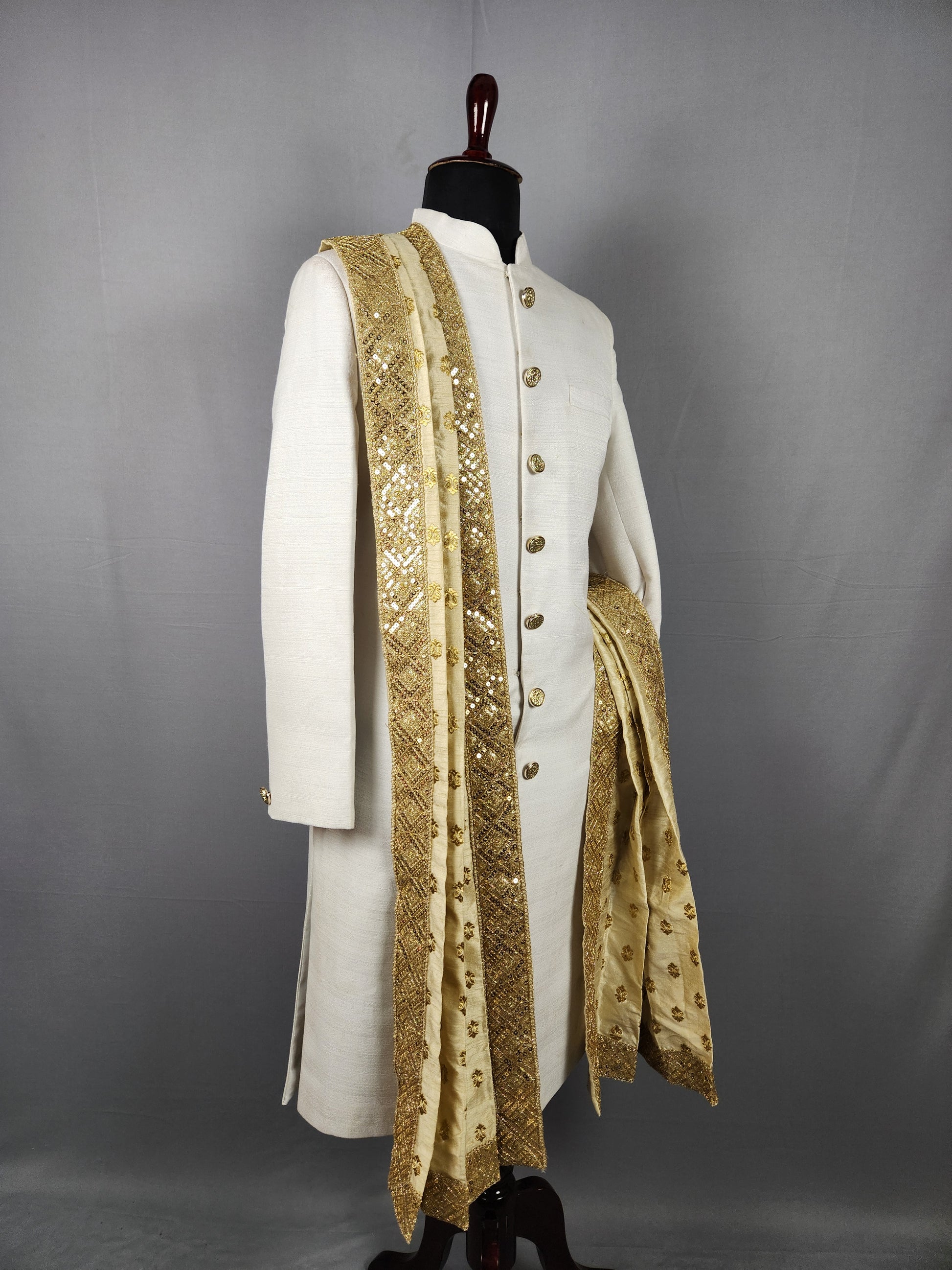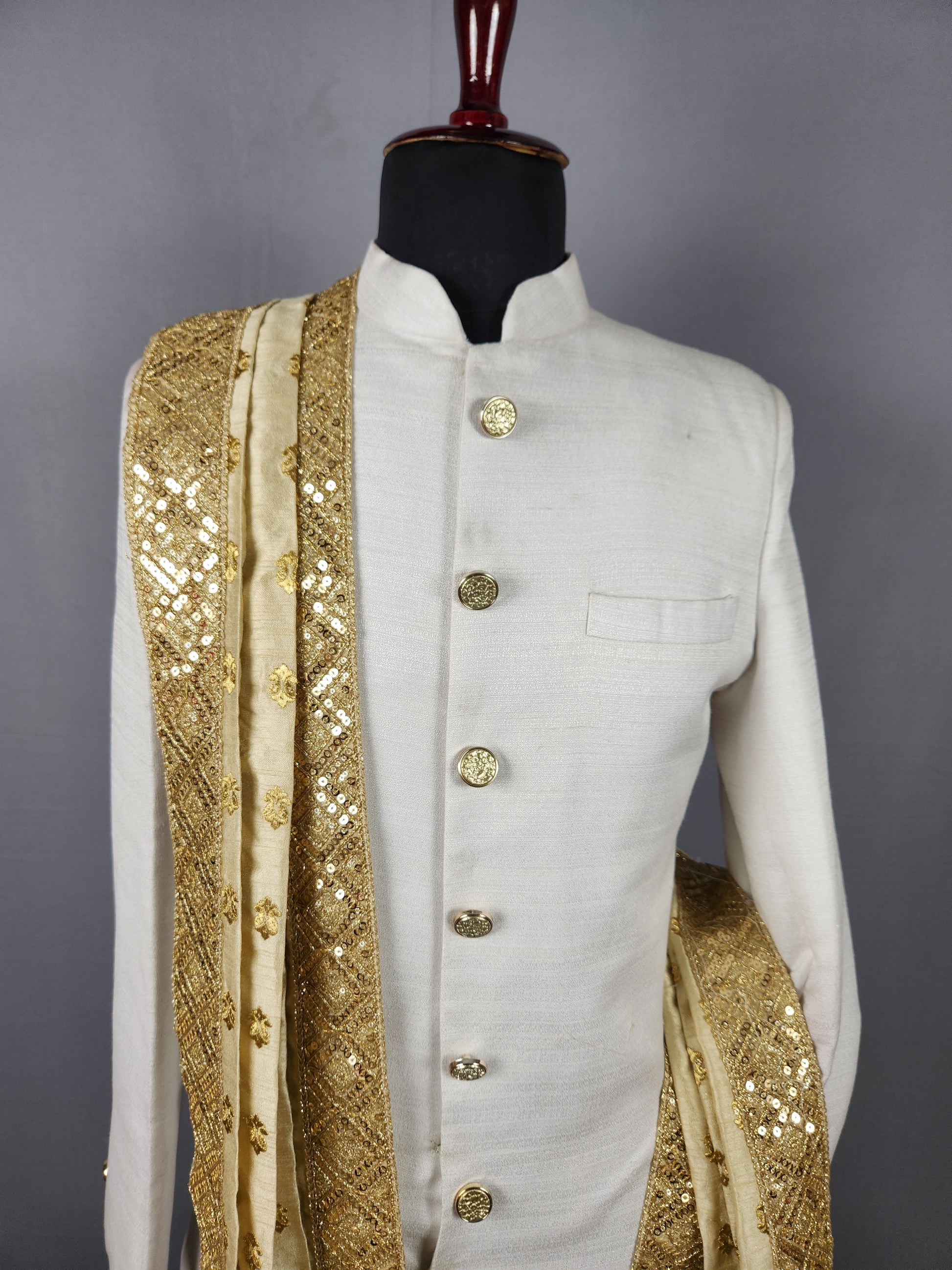 Add timeless elegance to your wedding look with this Golden Wedding Shawl for Groom, crafted from premium fabric and detailed with delicate embroidery. Lightweight and comfortable, it drapes effortlessly over any Sherwani or Indo-Western outfit, adding a regal, traditional touch—perfect for weddings, receptions, and pre-wedding events. This traditional sherwani shawl is an essential groom accessory for any Indian or Indo-Western wedding ensemble.