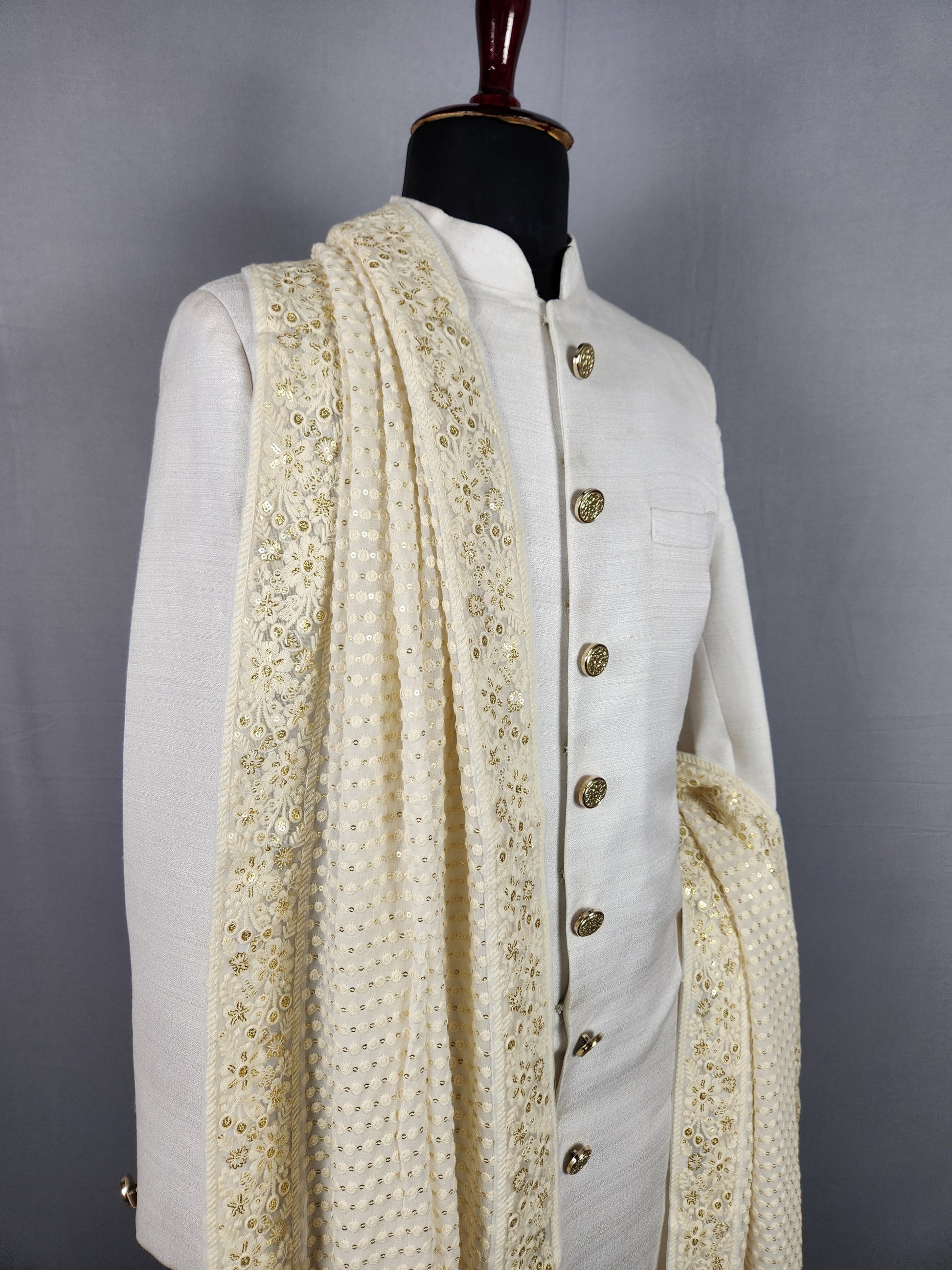 Add timeless elegance to your wedding look with this White Wedding Shawl for Groom, crafted from premium fabric and detailed with delicate embroidery. Lightweight and comfortable, it drapes effortlessly over any Sherwani or Indo-Western outfit, adding a regal, traditional touch—perfect for weddings, receptions, and pre-wedding events. This traditional sherwani shawl is an essential groom accessory for any Indian or Indo-Western wedding ensemble.
