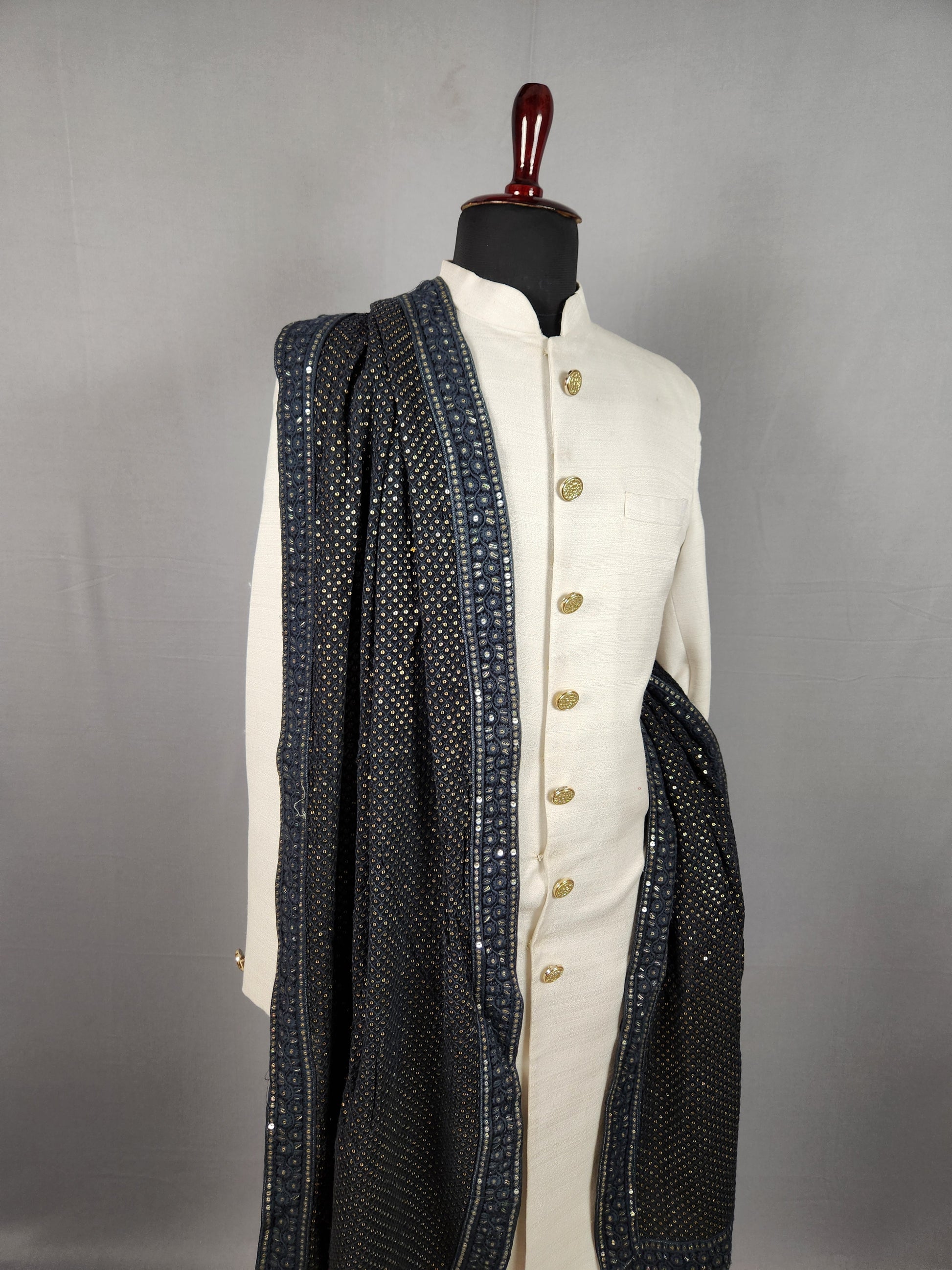 Add timeless elegance to your wedding look with this Black Wedding Shawl for Groom, crafted from premium fabric and detailed with delicate embroidery. Lightweight and comfortable, it drapes effortlessly over any Sherwani or Indo-Western outfit, adding a regal, traditional touch—perfect for weddings, receptions, and pre-wedding events. This traditional sherwani shawl is an essential groom accessory for any Indian or Indo-Western wedding ensemble.